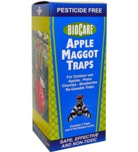 The proven answer to worms in apples, cherries and more! Mistaking the sticky red spheres of the BioCareย Apple Maggot Traps for fruit, pest flies become stuck, before eggs can be laid! Each package contains THREEย reusable red spheresย with THREEย lures,ย hangers and sticky glue coating.