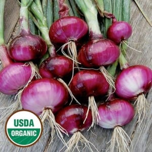 Crunchy and sweet with a mild bite!ย Red Wethersfield Onion (Allium cepa) yields lovely flattened globes — 4 to 6 inches across — with bright pink flesh that’s crispย andย delicious. Long-day type. Certified organic, and ready for harvest 100 days from transplant. Here are our best tips onย How to Grow Onions, too!