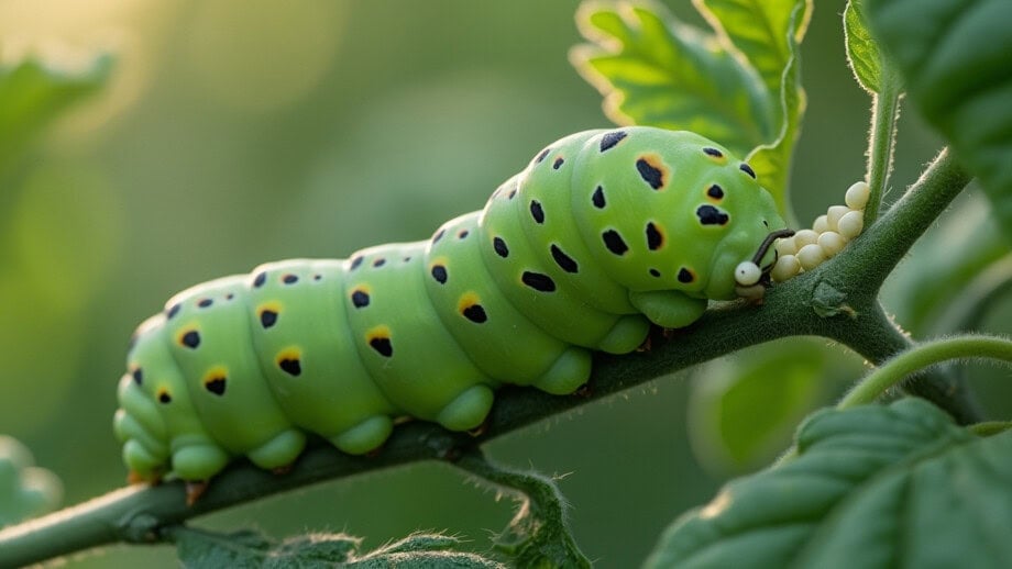 These destructive caterpillars are so big — three inches long or more — that it would seem to be easy to control them just by picking them off. And so it is, sometimes. Theย dilemma is that their pale green color provides excellent camouflage, and the nymph and larval stages are far smaller and less obvious. If there are only a few, picking them off works well. (One site suggests spraying the plant with water, causing the caterpillars to, and I quote, โthrash around,โ giving themselves away.) If there are more than a few, other measures may be called for. One of these isย Bt, orย Bacillus thuringiensis, an organic treatment that can control numerous otherย caterpillars as well.